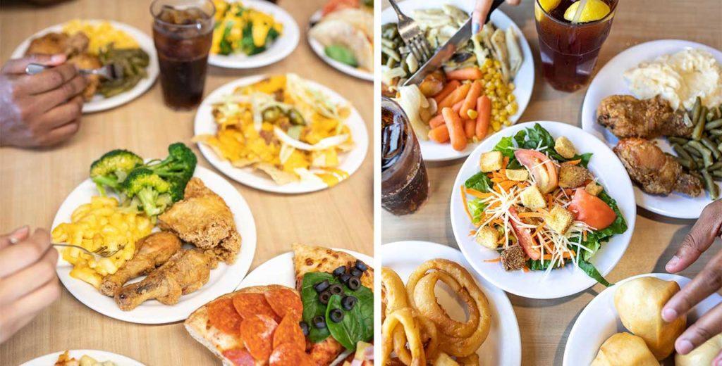 The endless lunch buffet features a wide variety of home-style classics like our pot roast simmered for 10 hours, made-from-scratch meatloaf, crispy fried chicken, creamy mac and cheese, made-from-scratch mashed potatoes, beloved Bourbon Street Chicken, so many fresh salad choices, dessert choices, and many other items.