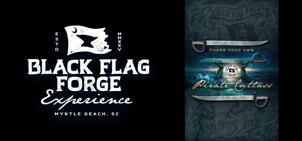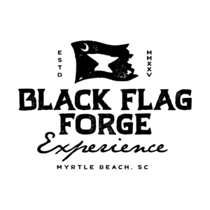 YOU can try your hand at true blacksmithing with us at the Black Flag Forge! Craft your own steel treasures with guidance from our friendly smiths in under an hour for as little as $35, all at our workshop in Myrtle Beach located at Broadway at the Beach. Whether it’s a hairpin or copper coin, a functional knife, or even an ambitious war hammer or Pirate Cutlass sword, there’s an experience waiting for everyone—complete with newfound craftsmanship confidence, epic photo opportunities while you hammer glowing steel, and memories you and your family will never forget!
