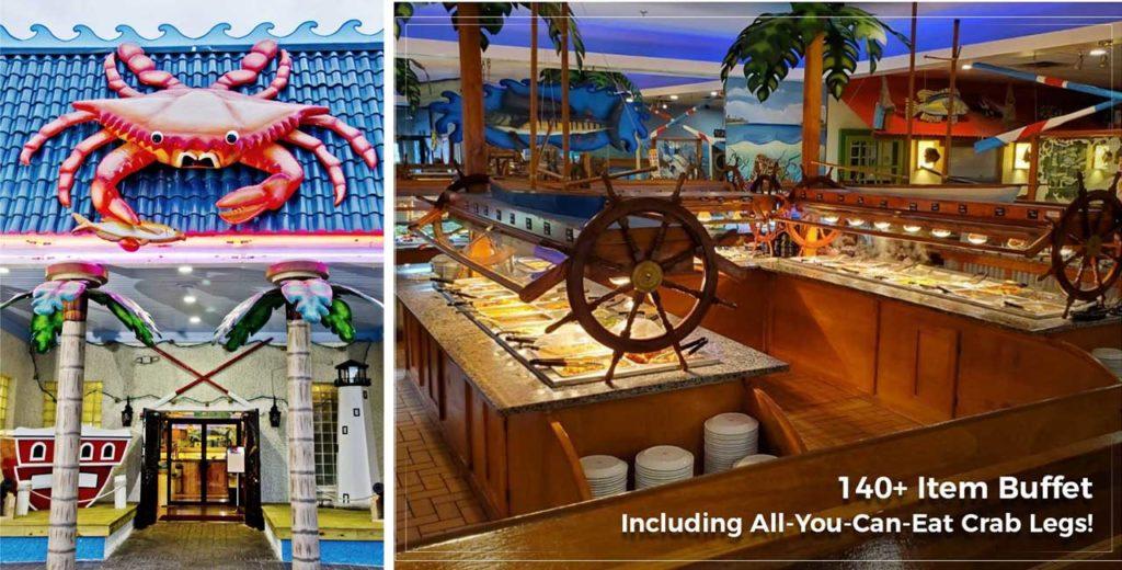 The best seafood buffet in North Myrtle Beach promises to provide their guests with a generous, delicious meal that reflects a high level of quality you would never expect at a 140+ item seafood buffet. Begin your evening with an original recipe She Crab Soup, New England Clam Chowder or a non-seafood soup of the day. The Salad Bar features fresh tossed greens and vegetables highlighted by homemade dressings and all the fixins’. The Raw Bar has fresh oysters, clams, shrimp and crab, while the Steam Bar features AYCE Snow Crab Legs, steamed shrimp, mussels in garlic and wine, oysters, and clams. A full Pasta Bar cooks to order. The stars of the show are Original Recipe Seafood Strudel, Oysters Rockefeller and Shrimp Creole. There are plenty of seafood favorites from shrimp and clams to salmon and tuna. Whole lobsters and AYCE lobster are available on request. Land entrees feature ribeye and T-bone steaks, prime rib at the carving station, baked and fried chicken. Plus, there are plenty of vegetables and extras. Of course you may wish you started with desserts. Captain Jack’s desserts, all made on site are famous near and far. Kids items are on the buffet and an adult menu for light eaters is available.